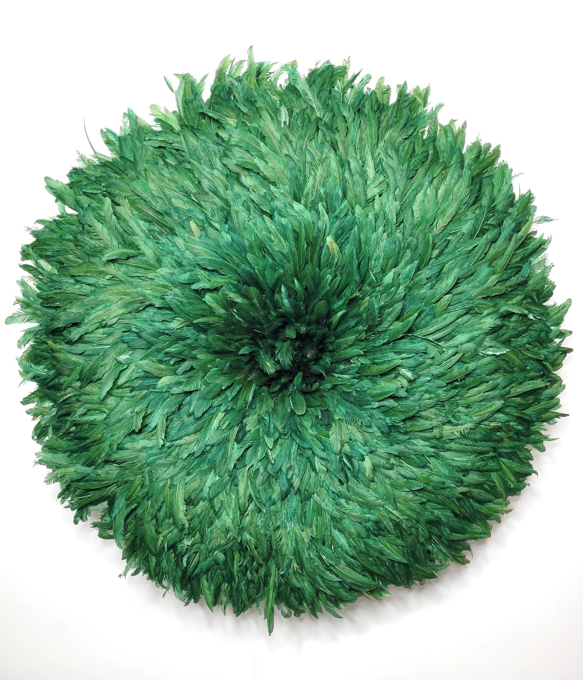 This artful Juju Hat, the Tyn Hat was handcrafted in Cameroon. For centuries, Bamiléké tribes have been making those hats that symbolize prosperity and freedom. Once, Juju Hats were worn by medicine men and royalties during tribal ceremonies. Nowadays, their customs are less restricted during Bamiléké traditional rituals and their beauty has reached homes beyond Cameroon’s borders. Those headdresses are very impressive hung on walls. Juju hats are made from natural or dyed feathers and woven raffia. Artisans take 2 to 3 days to complete one hat.